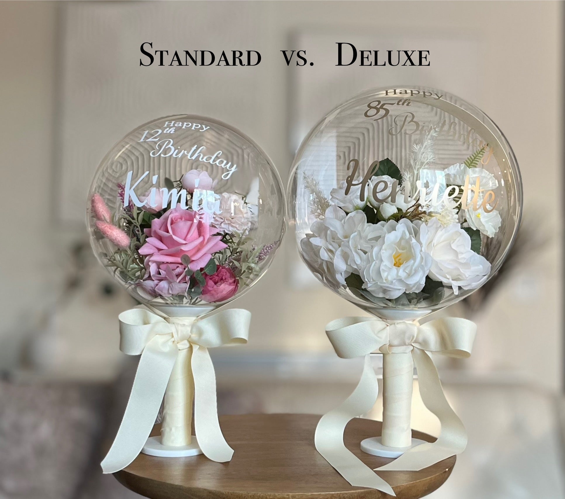 - Balloon-encased faux flower arrangement (Standard size unless upgraded)